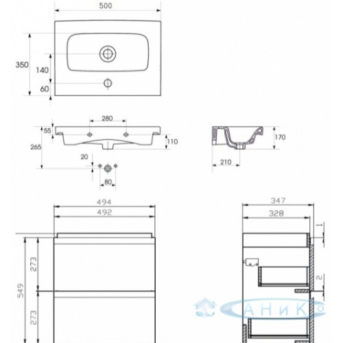Сет из шкафчика под умывальник и умывальника Moduo Slim 50. Фасады и корпус шкафчика изготовлены из лакированого ДСП. Удобная фрезерованая ручка. Система бесшумного закрытия soft close. Внутри шкафчик серого цвета.