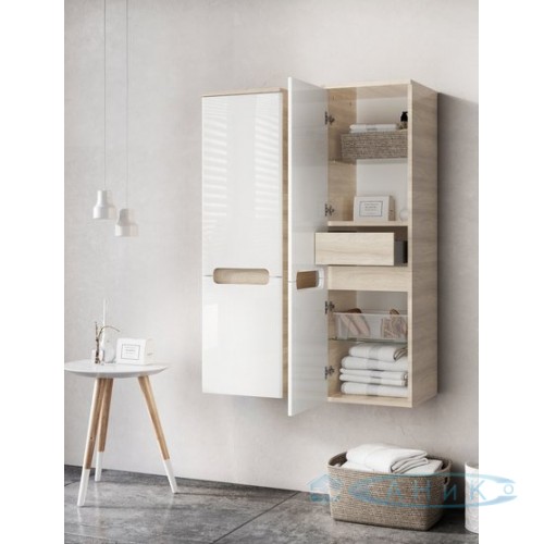 Верхняя часть корпуса оснащена двумя стеклянными полочками и практичным ящиком. Шкафчик поставляется в собранном виде. Цвет корпуса - капучино, дверцы белого глянцевого цвета (крашенный МДФ). В комплектацию изделия входит монтажный набор (болты, петли, заглушки).