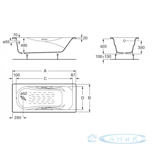 Ванна Roca Malibu 160x75 прямоугольная чугунная ванна с противоскользящим покрытием и ручками.