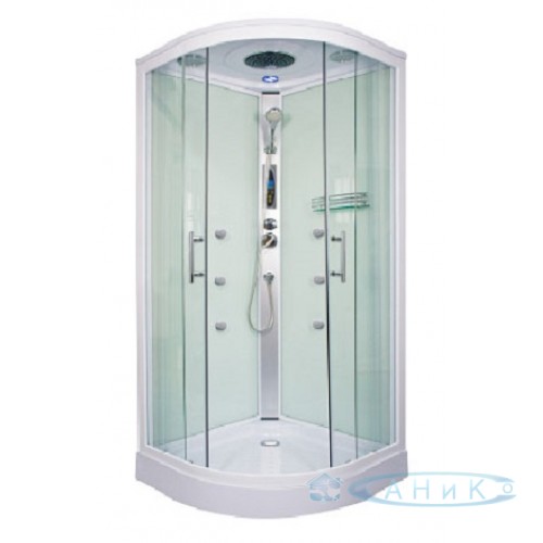 В комплект входят: электронная панель управления, радио, гидромассаж (6 форсунок), верхний душ, съемная душевая лейка, подсветка, стеклянная полочка, смеситель, стальные ручки.