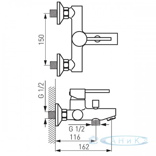 Настенный смеситель для ванны и душа. Устанавливается на два отверстия, поток воды регулируется однорычажным механизмом с керамическим узлом смешивания.