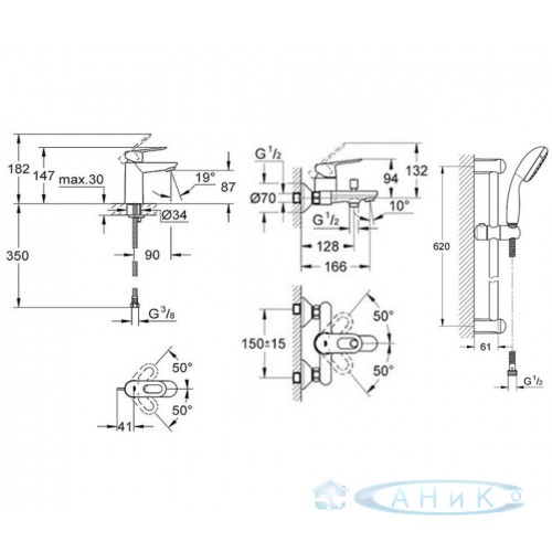 3. Душевой гарнитур Grohe Tempesta 27598000 (ручной душ, 27597000; душевая штанга 600 мм, 27523000; душевой шланг 1750 мм, 28154000).