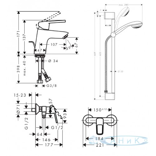 3. Душевой гарнитур Hansgrohe Crometta 85 (27728000) (ручной душ Crometta 85 мм Mono, (28585000); душевая штанга Unica Crometta 650мм, (27615000); душевой шланг Metaflex 1,60 м, (28266000)).