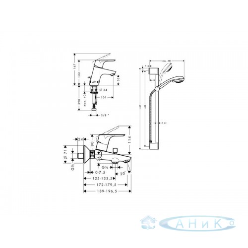 3. Душевой гарнитур 27763000 (ручной душ 28562000, душевая штанга 650мм 27615000, душевой шланг 1600 мм 28266000)